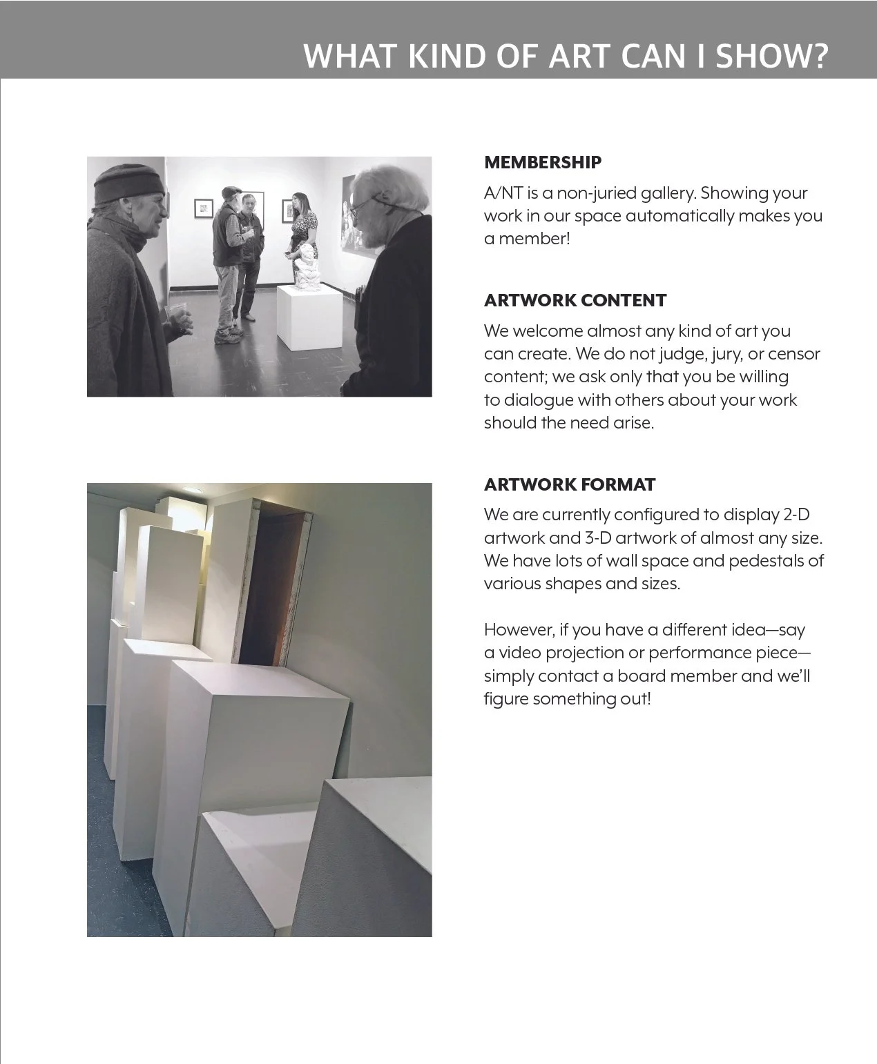 Artists show your work. You decide what to show, when to show, and how much to pay. Free admission, low to moderate cost artwork, friendly service.